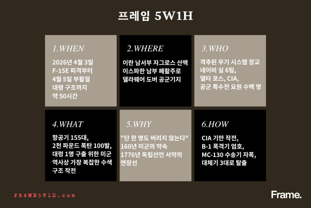 CIA가 움직였다. 비밀 감시 드론이 이란 상공을 소리 없이 훑기 시작했다. 수백 명의 특수작전 요원이 소집됐다. 네이비 실 6팀. 오사마 빈 라덴을 사살했던 바로 그 부대였다. 트럼프 대통령이 나중에 공개한 숫자는 항공기만 155대. 대령 한 명을 구하기 위해 동원된 자산의 총량은 웬만한 국가의 전면전 규모였다.