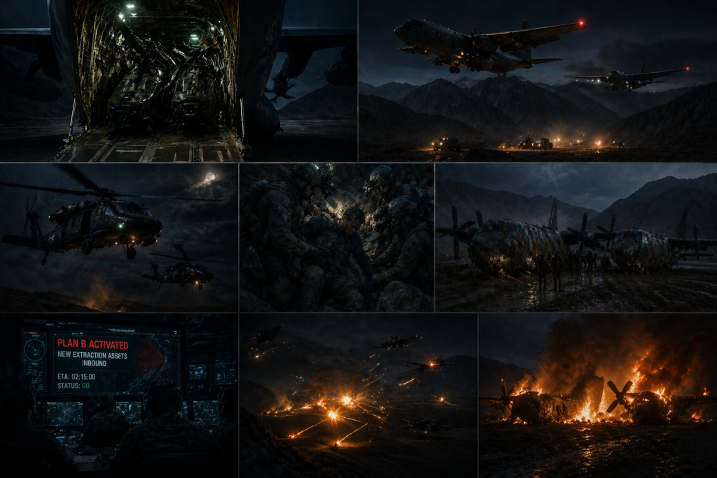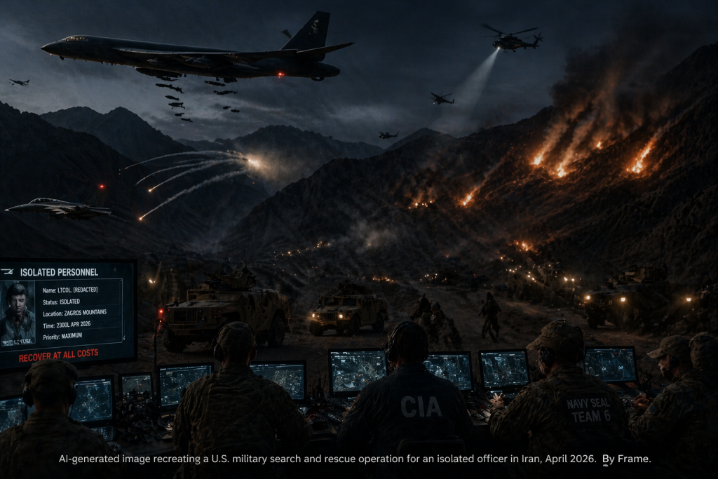 AI-generated image recreating a U.S. special operations extraction mission in Iran’s Zagros Mountains, April 2026, including MC-130 deployment, helicopter insertion, and emergency exfiltration under fire. By Frame.