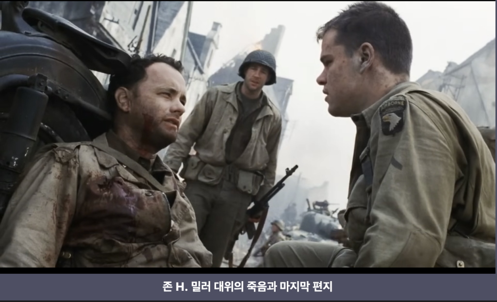 수십 년 뒤, 백발의 라이언이 노르망디 미군 묘지의 밀러 대위 묘 앞에 선다. 흰 비석이 수평선까지 이어진 자리다. 그는 돌아서서 아내에게 묻는다. 내가 좋은 사람이었소? 내가 그럴 만한 삶을 살았소?