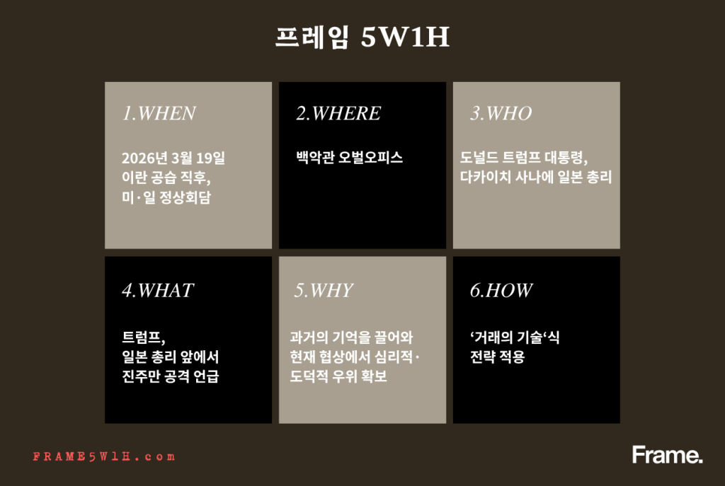 다카이치 앞에서 진주만을 꺼낸 것도 같은 맥락이었다. 일본이 가장 아픈 역사적 상처를 공개된 자리에서 건드려, 호르무즈 파병 요구를 거절하기 어렵게 만드는 압박이었다. 외교 사안을 외교 언어로 다루지 않고 거래 언어로 재코딩하는 것. 그것이 트럼프식 기선 제압의 핵심이다.