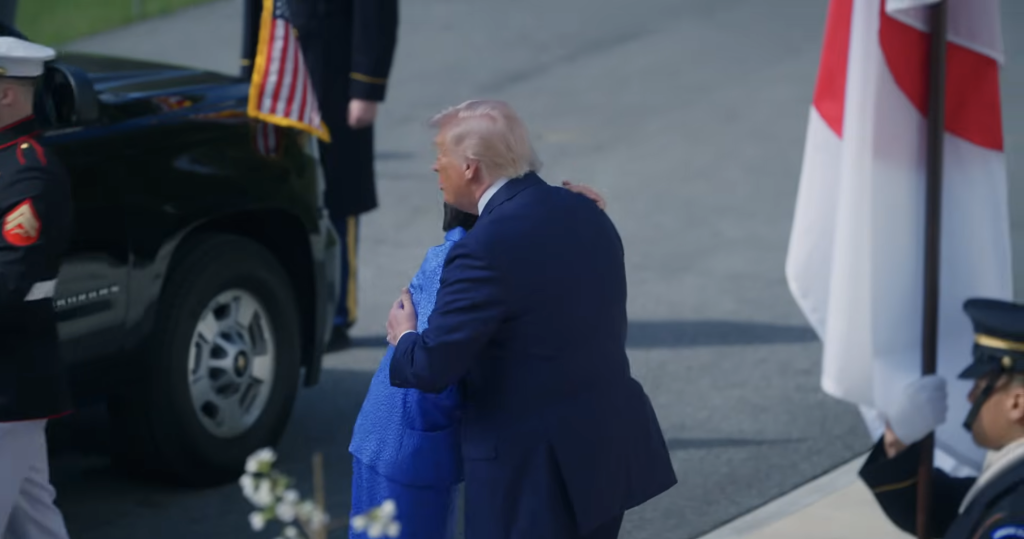 차에서 내리는 순간부터 시작됐다. 손을 내미는 트럼프에게 그녀는 와락 안겼다. 악수 대신 포옹이었다. 회담장에서는 “세계 평화를 이룰 수 있는 사람은 당신뿐입니다, 도널드”라며 직함 대신 이름을 불렀다. 저녁 만찬에서는 트럼프의 외모를 칭찬했고, 막내아들 배런의 생일 축하도 잊지 않았다. 진주만 농담이 터졌을 때는 눈을 크게 뜨고 입을 닫았다.